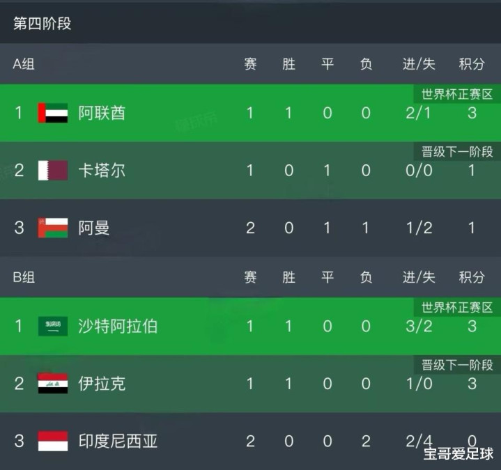世预赛亚洲区第四阶段A组的3支球队分别是阿联酋、卡塔尔和阿曼,首轮阿曼0-0卡塔尔,第二轮阿联酋2-1阿曼,目前阿联酋3分排名小组第一,卡塔尔1分排名第二,阿曼两场比赛只得1分排名垫底,已经提前1轮被淘汰,小组头名将在阿联酋和卡塔尔之间产生。B组的3支球队分别是沙特、印尼和伊拉克,首轮印尼2-3沙特,第二轮伊拉克1-0印尼,目前沙特3分排名小组第一,伊拉克3分排名第二,印尼两场只得0分垫底已经被淘汰,小组头名将在沙特和伊拉克之间产生。